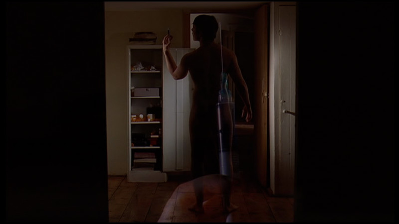 La symbiose entre le héros de Brain damage et son hôte, basée sur la dépendance mutuelle, se révèle un fiasco. Pire, tailler une bavette – très concrètement cette fois – avec Elmer dérange le spectateur, en bousculant les normes biologiques établies par les lois de l’Evolution. Face à notre impossibilité à accepter rationnellement la supériorité d’un parasite régressif tout droit sorti des cauchemars de la petite enfance, nous vivons cruellement l’abandon de Brian, amené à se barricader pour jouir en solitaire de cette union contre-nature. Elmer, qui supplée à l‘appel de la couette ( plusieurs scènes s’ouvrent sur le suaire bleu où s’enlise Brian ), à la tendresse du doudou par une fusion amoureuse ( pénétrations insistantes et orgasmiques qui nous sont montrées à un niveau presque expérimental ), peut figurer la conscience intentionnelle de Brian en nous dirigeant vers tous les champs de l’expérience phénoménologique, tendue à l’extrême entre trip psychédélique ultime et sensation de manque. A bien des moments, leurs échanges verbaux sont focalisés sur un débat où les besoins vitaux se heurtent aux valeurs morales du bien et du mal. Les morceaux d’encéphale extraits de son oreille sont alors autant de parts d’empathie qu’on nous arrache. Car cette solitude sans appel est celle d’une toxicomanie qui s’éprouve d’abord physiquement.