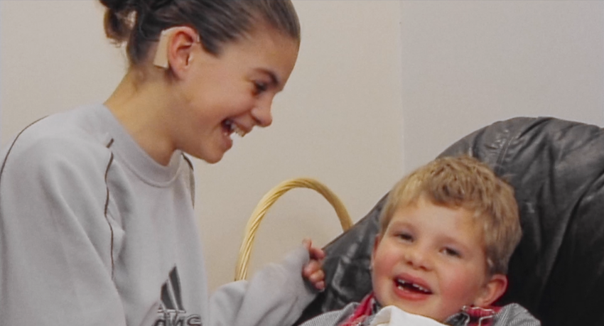 Dominique : Cette séquence n’était pas jouée. En fait, j’avais 80 heures de mini cassettes d’archives familiales, que la famille m’avait confiées, et dans lesquelles j’ai trouvé des pépites, des moments incroyables. C’est surtout la mère de Manon, Sylvie, qui a filmé. Elle avait capté des moments importants, à l’hôpital, des séances d’orthophonie, des moments entre les enfants…tout cela remarquablement bien filmé, avec le cadre tenu. J’ai fait un montage d’à peu près 1h30 que je leur ai montré, car ils n’avaient jamais revu leurs archives. Je leur ai proposé de regarder lors de ce moment suspendu de vacances, qui était le choix de la temporalité du film. Au présent, c’est ce moment de vacances où on prend le temps de revenir sur le passé, de raconter l’histoire familiale…