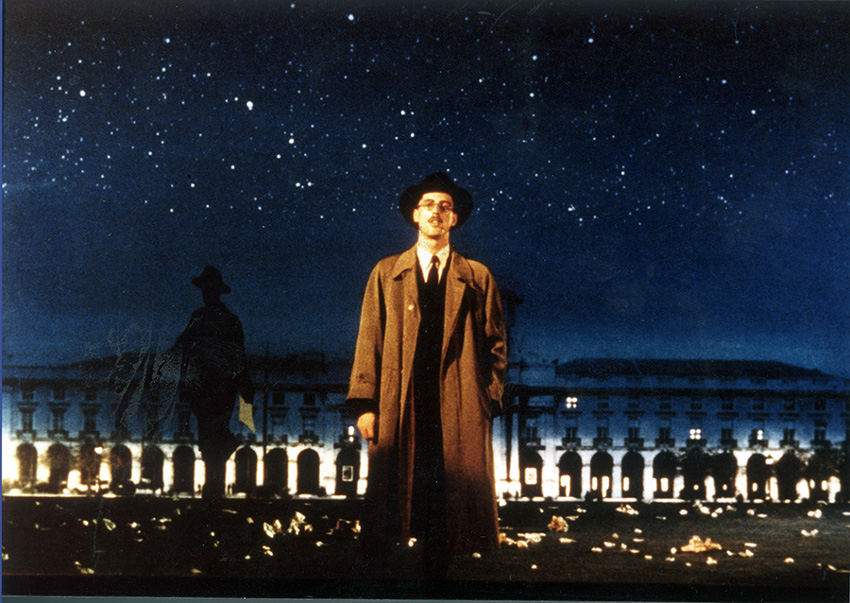 Oui, j’avais discuté avec Syberberg. Parce que quand j’étais à l’école de cinéma, j’avais organisé la première Semaine des Cahiers ici à Lisbonne, à Gulbenkian. Douze personnes des Cahiers étaient là pour l’occasion : Comolli, Daney, Dubroux, tout le monde était là. Je dirigeais le festival, mais ce n’était pas moi mais les Cahiers qui avaient choisi les films. Syberberg est passé avec Karl May. Il m’a dit : « Non, ne fais pas ça, c’est compliqué et très cher ! » Moi j’ai étudié la chose et je suis allé à l’INA. Mais pour avoir des images en mouvement, il fallait projeter griffe contre griffe. Ce qui faisait beaucoup de bruit ! Alors j’ai essayé de faire la projection avec un prisme inversé. Ce sont des images fixes, il n’y a pas de mouvement en arrière-plan.