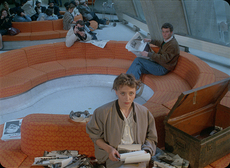 Laurent Roth excelle dans l’art de donner forme à sa pensée. La masse historique se voit endiguée par des intermèdes entre fiction ( un embryon d’intrigue autour du personnage de Mireille Perrier « débarquée » à l’aérogare de Roissy, puis d’un mystérieux photographe qui la traque à son tour ) et reportage ( les interviews réelles d’anciens reporters qui témoignent de leur métier ). L’Auteur crée une mise à distance par le point de vue oblique de cette jeune femme qui nous amène à questionner l’agencement et les significations de son discours. Avec la flamboyance de son contemporain Carax ( Laurent Roth vient de découvrir peu auparavant Mireille et le cinéma de Leos Carax dans Boy Meets girl 11 ), l’architecture moderne de l’aéroport, ses formes et lignes aiguës composent un paysage intérieur menaçant de s’écrouler sur la fille comme les fantômes enfermés dans la cantine de Jean Peraud, reporter mort au combat à 29 ans. Par les angles de ses prises de vue, l’intranquillité habitant le découpage – le film se tourne au moment où une vague d’attentats déferle sur Paris, ce qui a motivé le tournage à Roissy comme lieu potentiel d’une embuscade actuelle – et les gros plans sur ces visages burinés aux regards lointains ou sur son interprète principale égarée dans un monde sans femmes, Roth inscrit sa réflexion dans le présent. Pas uniquement pour l’étrangeté du décor à l’instar du Luc Besson de Subway, mais par la capacité de réaction de l’héroïne à cet environnement. Sa gravité est semblable à celle d’Alex, le héros de Mauvais sang rongé par une maladie qui ne s’attaque qu’aux jeunes, ici celle d’une vie qui glisse entre les doigts à la vitesse d’un projectile. Quelques rares plans métaphoriques n’en sont que plus fort, en particulier celui de la cantine du rapatrié qui traverse le plan en diagonale comme l’âme du disparu montant au ciel.
