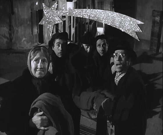 Le film est, par conséquent, une course collective échevelée, qui, un peu dans la tradition du burlesque américain, est autant scénarisée que chorégraphiée, dans un rythme endiablé de réparties et de mimiques, fondues dans un mouvement d’ensemble incessant. La farandole carnavalesque joue sur les aspirations opposées de son duo burlesque : Gabillo l’opportuniste qui mime la grandeur d’âme, et Placido, son petit subalterne, aux préoccupations on ne peut plus pragmatiques. L’absurde guette à tous bords dans cette mauvaise farce : la charité chrétienne se fait déborder par le mercantilisme et la publicité ; chacun se prête de mauvais cœur au fardeau vu la crasse des invités ; et même, certains des vieux nécessiteux de l’asile, pobrecitos trop ballotés, finissent par rendre l’âme en chemin… La charité tourne donc au fiasco sacrilège. Les plus précaires d’entre eux, Placido et les siens, en seront même réduits, après avoir œuvré sans relâche au bien-être des pauvres, à prendre un repas d’indigents, devenant ironiquement les premiers laissés pour compte de ces félicités en trompe-l’œil.