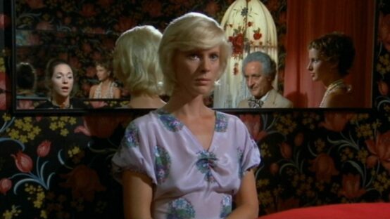 Il y a bien entendu une densité psychanalytique très forte dans le film Le Parfum de la dame en noir qui, vous l’aurez compris, n’a strictement rien à voir avec le roman à énigmes du même titre de Gaston Leroux. La beauté du long métrage de Francisco Barilli réside dans sa manière de ne jamais tenter l’exposé scientifique, bêtement explicatif, de ce voyage dans l’Inconscient malade de Silvia ; ce dévissage progressif devient la pâte esthétique du film, les affects puis la folie de la jeune femme faisant tache d’huile et contaminant la mise en scène, ses compositions de plans éminemment picturales, remodelant une réalité qui a tout d’un monde devenant peu à peu cauchemardesque, le passé surgissant physiquement dans un présent qui semblait être protégé des attaques traumatiques. Outre les conversations de Silvia avec une petite fille en robe bleue (Lara Wendel), comme une Alice sortie d’une psyché, qui s’avèrera être elle-même enfant, ou les affrontements de la jeune femme avec ce terrible beau-père comme sorti de la tombe de sa mémoire (interprété par Orazio Orlando), voire cette horloge à l’effigie de Mickey Mouse prouvant que Silvia n’a jamais véritablement laissé son enfance au rebut, la mise en scène elle-même exhume le passé par quelques codes chromatiques semblant témoigner d’une omniprésence du traumatisme dans le monde adulte du personnage. Le bleu, le rouge et le vert parsèment ainsi la quasi-totalité des plans du film de Barilli, chacun représentant respectivement l’enfance indélébile, la mère (qui s’était suicidée devant elle, incarnée par Renata Zamengo) et le beau-père qu’elle avait surpris au lit avec sa mère avant de le défigurer quand il voulut l’attoucher. Et ces couleurs de scintiller continuellement dans les espaces visités par Silvia, de façon parfois très discrète mais toujours à même de focaliser l’attention du spectateur, présence toujours incongrue, là sans que l’on ne s’en rende toujours vraiment compte mais néanmoins toujours là. Comme d’étranges présences spectrales.
