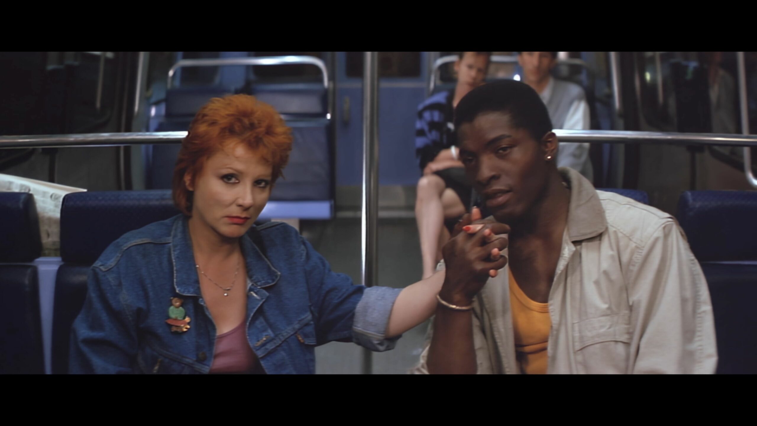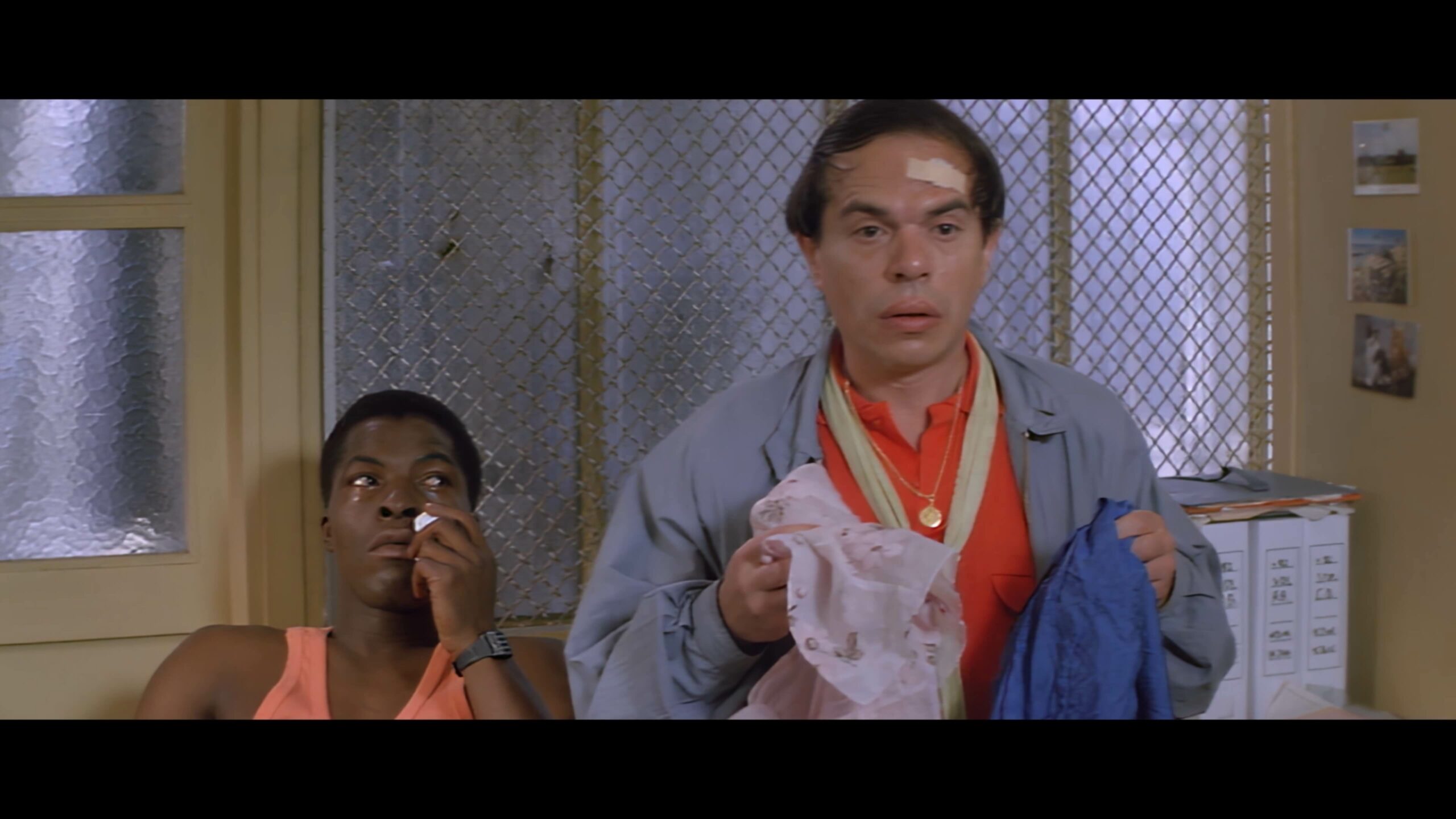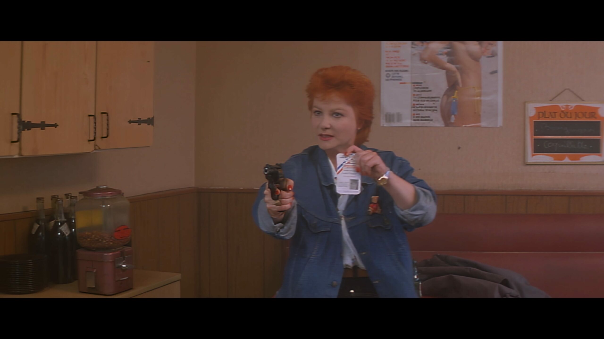 Les Keufs avance sur deux dynamiques de récits mais ne parvient jamais à faire dialoguer pleinement ses deux élans. L’intrigue de fond assez sombre et aux accents violents, un proxénète kidnappe l’enfant d’une de ses prostituées pour la retrouver et se venger, soit presque une version franchouillarde de Vice Squad, n’occupe qu’aléatoirement le centre du long-métrage. Partiellement délaissée avant de revenir au premier plan dans les dernières minutes, elle cède sa place à une romcom mixte plutôt attachante entre les deux personnages principaux qui fragilise cependant la tension. Les deux registres ne se nourrissent qu’insuffisamment entre eux, la farce est contrariée par la gravité du polar et le polar est allégé par des ressorts comiques, la romance quant à elle doit affronter un running gag où on leur demande leurs papiers : ils sont l’un et l’autre l’incarnation concrète de changements dans la société française, bien qu’ils doivent encore s’en justifier. Finalement Josiane Balasko fait le constat que ce genre si populaire est à l’image du pays, prisonnier de vieux réflexes avec lesquels il faut composer ? Si elle ne peut pas le modifier en substance, elle peut néanmoins remodeler son apparence et cela passe en partie par son casting. Pari gagnant avec Jean-Pierre Léaud qui dévoile une folie comique inattendue ou le charismatique Isaac de Bankolé moins immédiatement à l’aise avec le comique pur, qui tient cependant un appréciable premier degré. Derrière la dimension récréative, Les Keufs dessine les contours d’une veine qui deviendra à la mode dix ans plus tard avec le premier Taxi, plus spectaculaire mais aussi nettement plus rétrograde socialement. Ce n’est peut-être pas une réussite pleinement aboutie, il constitue en revanche le symptôme précieux d’un moment où la comédie française tente, sans toujours y parvenir, d’accompagner les mutations sociales qui la traversent. L’édition proposée par Rimini s’accompagne d’une interview inédite de Josiane Balasko qui revient avec enthousiasme sur le film, disant s’être bien amusée, parlant de sa découverte d’Isaac de Bankolé dans Black Mic-Mac ou du pari Jean-Pierre Léaud qui avait eu des démêlés avec la justice, l’éloignant des plateaux de cinéma.