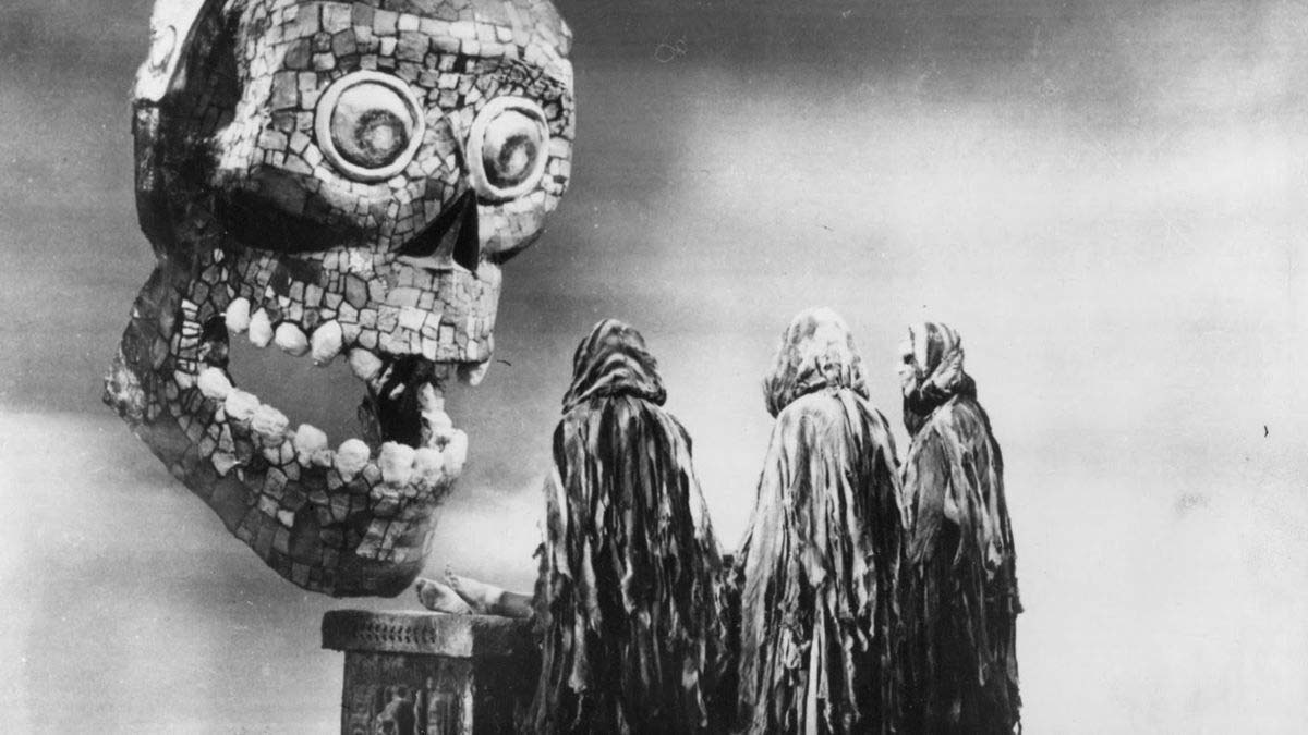 Les portes du rêve s’ouvrent sur un monde morbide et merveilleux entre estampes et eaux-fortes irréelles. Certes, sa civilisation exotique sacrificielle, et ses costumes aux frontières du péplum prêtent à sourire mais c’est le charme des dérives somnambules et cauchemardesques qui l’emporte, l’errance surréaliste et poétique. De plus, les effets d’expérimentation de montage, d’éclairages, le jeu sur les profondeurs et les couches dimensionnelles ont quelque chose d’envoûtant, de grisant. La majorité des songes pensés à l’origine par Slavko Vorkapić ne furent jamais tournés compte tenu du budget limité et ce fut Julian Roffman qui s’en chargea finalement, sans doute à partir des dessins préparatoires. Leur folie contraste tellement avec le reste du film qu’il est pourtant permis d’y déceler tout le génie et l’imagination Vorkapić, à la manière des rêves de Dali dans La Maison du docteur Edwards. Un peu oublié maintenant, Vorkapić eût pourtant une importance comparable à celle d’Eisenstein pour son expérimentation technique tant au niveau du montage que de ses mouvements de caméras surprenants. Cinéaste expérimental, théoricien du cinéma, monteur, illustrateur et peintre né en Serbie, son nom fut même employé pour définir une technique particulière de transition dans le montage. Capra utilisera Vorkapić sur Mr Smith au Sénat, notamment lors d’une mémorable mise en image des tourbillons de pensées à l’intérieur de la tête de James Stewart. A l’intérieur d’un b-movie comme The Mask, de tels passages laissent bouche bée. De même, le compositeur de musique électronique d’avant-garde Myrron Schaeffer est en grande partie à l’origine de la bande son (Electro-Magic Sound prévient l’affiche !) atonale et tribal, qui en envoie dans les basses et les bruits stridents, lorsque se profile l’angoisse, se révélant presque hypnotique, comme les pulsations agissaient sur nos propres battements de cœur. Ces cauchemars nous aspirent dans un monde païen ancestral, comme une Atlantide de rites morbides, qui nous libèrent de toute narration. Certes cette démesure est irrégulière, nous laissant impatiemment espérer le prochain moment où nous endosserons nos lunettes magiques, qui nous laisse pénétrer dans l’antre, quelque part entre l’enfer et le psychédélisme. Le cinéaste met en scène des chorégraphies fantasmagoriques, en suspension, qui nous rappellent parfois Michael Powell. On y croise des fantômes blafards, des expressions figées dans leurs masques. On se perd dans les toiles d’araignées, suivant les rives d’un Styx au milieu des squelettes, au sein d’un très bel univers funèbre, tel un train fantôme poétique.