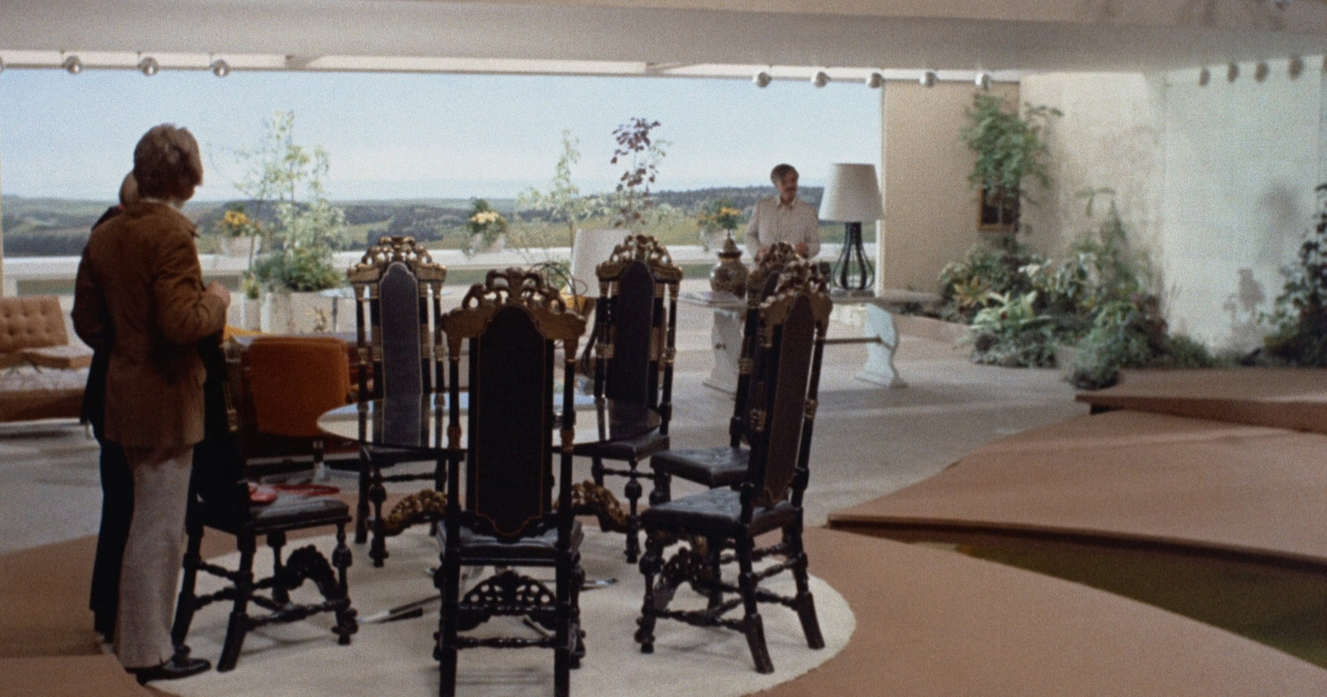 Ce paysage du fantasme et de la malédiction, de la passion qui s’entremêle aux éléments rappelle en effet énormément Daphné du Maurier plus encore que Christie. Le décor devient un leitmotiv qui investit l’intrigue comme un personnage omniprésent et omniscient. On ne le quitte jamais tout à fait, ce domaine maudit futur lieu du crime, celui que l’on rêve comme un lieu idéal de vie et qui apportera la mort. Comme il y eut Hurlevent, Manderley ou Dragonwyck, Gipsy’s Acre étend son emprise presque surnaturelle durant Endless Night, passant de l’entité protectrice à la prison malfaisante. Quel curieux sentiment également que cette évolution d’un paysage avec ses vieilles bâtisses en ruines tutélaires avec son charme suranné laissant place à une maison design, moderne avec ses grandes baies vitrées, ses installations sophistiquées, son ouverture de toutes parts, mais qui finit par provoquer un sentiment de claustration. C’est probablement ici que Christie libère le plus sa critique des nouvelles architectures, perdues dans un confort moderne aseptisé qui dénature le paysage autant qu’il déshumanise. Cette splendide villa design construite par l’architecte de renom (personnage désenchanté d’une grande complexité sublimé par l’interprétation de Per Oscarsson) donne rigoureusement la même impression que les architectures luxueuses de Ténèbres d’Argento ultra-sécurisées, donc lieux du crime idéaux.
