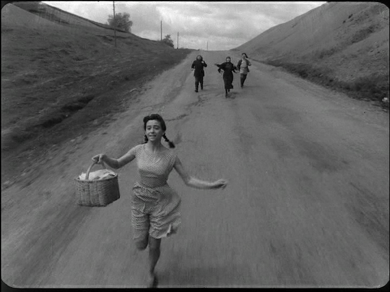Mais dans Moi, ma grand-mère Iliko et Illarion, Abouladze paie aussi son tribut à Vertov, avec des raccords qui ne sont que mouvements purs et rappellent ses « intervalles ». « Chez Vertov, l’intervalle de mouvement, c’est la perception, le coup d’œil. L’œil ». 4 Ou les recherches de l’Avant-garde européenne « C’est une coupe mobile, c’est à dire une perspective temporelle ou une modulation ». 6 Le geste n’est pas gratuit. Abouladze déplace le curseur temporel sur son film-route, utilisant au maximum les possibilités spécifiques de son médium, car « le cinéma réalise le paradoxe de se mouler sur le temps de l’objet et de prendre par surcroît l’empreinte de sa durée ». 7 Son opérateur, Georgui Kalatozichvili ( fils du génial Mikhaïl Kalatozov et futur réalisateur ) traduit parfaitement les idées les plus audacieuses du metteur en scène, tel ce travelling avant en caméra portée qui papillonne dans la foule à l’instant des adieux. L’alliance de la forme et du fond se réalise dans cette séquence équivoque, comme dans le moment magnifique où ce fils qui part au front, Koukouri, joue une dernière fois de la trompette pour sa mère. Les plans terminaux, suite de compositions statiques, jouent du tragique en détournant le sens plastique classique d’Eisenstein, trouvant d’incroyables diagonales ! Les absents continuent alors d’habiter le cadre à travers les instruments abandonnés, sublime évocation des martyrs de la guerre, sans jamais héroïser leur sacrifice. Abouladze cloue sur place la détresse de cette populace magnifique dans un travelling arrière contraire au précédent, apprêté et spatialisé. Jusqu’à ce petit bonhomme dérisoire qui termine seul, bord cadre, avec sa clarinette, statufié dans une posture ridicule qui peine à contenir la noblesse du père éploré. Le montage apparaît ici comme un travail de condensation assez similaire à celui du rêve. La caméra-œil tient le rôle de témoin et les frontières avec le documentaire deviennent poreuses quand Zuriko lui jette un regard de défi, l’objectif choisissant de se détourner pudiquement de leur premier baiser.
