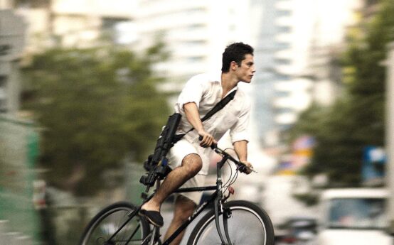 Ce qui frappe d’entrée c’est la géométrisation de la millimétrique mise en scène de Rosenberg, pendant que Shlomi fuit horizontalement (l’impact de très nombreux travelling accompagnateur de la désertion), « la guerre » bombarde verticalement (le ciel très souvent filmé en contre-plongée), le dôme de fer d’en haut protège l’homme qui fuit d’en bas. Et le film ne cesse d’alterner cette imaginaire de lignes croisées, réussissant parfaitement à intensifier son action, survolter cette escapade mortelle en l’accompagnant d’une bande-sonore agressive, un ton jazzy brutal, presque désaccordé, en contre-point de l’apparente tranquillité d’une Tel-Aviv qui semble vivre dans l’insouciance (les gens bronzent sur la plage, déjeunent au restaurant, boivent des coups au bar). « Qui semble » car la guerre est partout dans ce faux paradis exotique, dans chacun des recoins (là où Shlomi cachera son arme derrière une poubelle), dans toutes les discussions (un débat s’enclenche dans un bar), les espaces VIP sont transformérs en refuge anti-bombardement, l’omniprésence des écrans de télévision abreuvant la population d’information continue, Shlomi prend même la liberté de se balader fusil d’assaut vissé à son torse et à vélo sans que personne ne bronche, la musique pop des bars s’entre-mêlent aux sirènes aériennes, la guerre est partout, tout le temps, et l’apparence trompeuse (y compris la tenue improbable de Shlomi en chemise en lin blanc et espadrilles) ne peut cacher la déferlante guerrière d’une capitale israélienne assiégée par le ciel, la peur, la psychose d’un peuple outrageusement fraternel (et cette scène très forte où des badots détroussent Shlomi de ses habits volés à des touristes français).