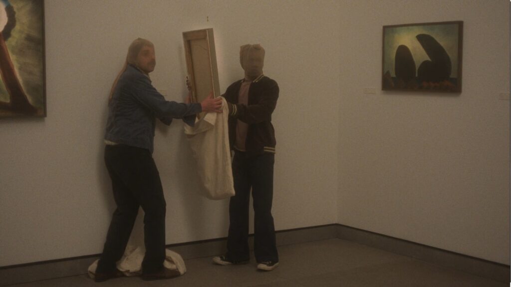 Le caper movie est un des genres dont les codes ne sont pas seulement des motifs ou passages obligés, mais les fondations mêmes du récit – et elles reposent en grande partie sur le personnage central, le cerveau du casse : constitution de l’équipe, explication du plan, préparation, exécution, péripéties de l’équipe – échec ou réussite, fuite, tragédie etc. On est donc curieux de voir ce que la réalisatrice de River of Grass (le film de crime sans crime), La Dernière Piste (le western qui se perd en route), et Wendy and Lucy (le road movie en panne) pouvait soustraire à un genre aussi solidement constitué, aussi abondamment parodié. Même, les premières et douces minutes du film dans le musée, terrain de jeu du casse, sont étonnantes : un jazz batterie de Rob Mazurek, et en lieu et place d’équipe, la femme et les enfants du protagoniste vont d’un point à un autre de l’espace – justifiant le montage – tandis que Josh O’Connor, dans une suite de gros plans très précis, vole une minuscule figurine historique.