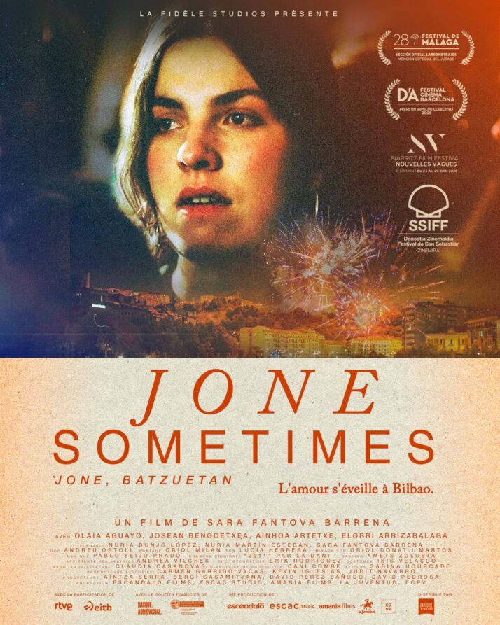 En dépit d’un titre à la première personne en guise de premier film en solitaire, Sara Fantova adresse dans le carton final de Jone Sometimes ses remerciements à une communauté tout entière, formée d’amis et de collaborateurs. À ce titre, on signalera que sa réalisation précédente pour le cinéma était une œuvre à plusieurs (La filla d’algú, 2019). Cette dimension collective imprègne indéniablement l’histoire devant la caméra, en suggérant que l’affranchissement de Jone repose aussi sur la solidarité au sein de son groupe d’amis. En effet, le film entend donner une certaine portée générationnelle et culturelle à ce qu’il dépeint. La trajectoire individuelle se double ainsi habilement d’un portrait plus large de la jeunesse basque, d’où émerge une forme de revendication politique, ne serait-ce que par le fonctionnement participatif de la Semana Grande, sans verser dans un schématisme appuyé pour autant. Elle-même originaire de Bilbao, mais diplômée d’une école de cinéma barcelonaise, Sara Fantova dit ne jamais avoir imaginé tourner son scénario ailleurs que dans la capitale euskara ni dans une autre langue que le basque.