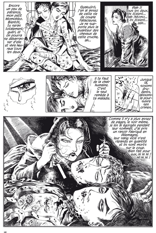 De conte cruel en conte cruel, Hanawa s’inspire parfois de faits divers qui défrayèrent la chronique, ou plonge dans le fantastique macabre et érotique : il nous enferme dans des intérieurs, théâtre des drames les plus sordides, avec leurs femmes violées et bafouées, les relations sexuelles contre nature telles qu’elles seront légions dans les pinku (et plus encore chez Teruo Ishii auquel il fait irrésistiblement penser). Sorti de ces lieux confinés, la violence fait rage au dehors de la guerre aux viols collectifs. La terre n’est que violence et passion charnelle corrompue. Mais sublimée par Hanawa, la barbarie est avant tout de l’Art. On voudrait accrocher les planches chez soi, comme des estampes, dignes des œuvres les plus tourmentées ou les plus explicites d’Hokusai. Toutes les déviances et les interdits y passent. Lorsqu’on ne se mutile pas, lorsqu’on ne séquestre pas une femme pour la traiter comme une truie, c’est pour donner à manger des bébés à des lézards géants, s’apprêter à faire l’amour avec un singe, donner à têter son sein à une poupée-monstre, ou se faire caresser par un homme cafard lubrique. La digestion devient un cercle coprophage sans fin ; les samouraïs belliqueux et masochistes se retrouvent pris à leur propre piège par leur épouse rusée…