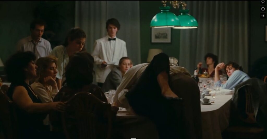 C’est donc tout logiquement que se met en place un motif (hérité de Tchekov et Dostoïevski) qui deviendra récurrent dans le cinéma de Chéreau, dernière manière : la réunion de famille nombreuse qui tourne au règlement de compte et à l’implosion (Hôtel de France, Margot, Ceux qui m’aiment, Gabrielle). C’est ainsi que sa mise en scène retrouve Visconti, mais de manière plus intéressante que les critiques ridicules des années 70 (l’intrusion du désir anarchique dans un corps trop bien organisé est après tout le sujet même de Mort à Venise (1971), et il n’y a pas à douter de son influence sur Chéreau). Dans une des premières séquences des Damnés (1969), le repas d’une famille aristocratique industrielle, négociant avec le nazisme depuis peu, tourne à la catastrophe et au meurtre. Visconti passe d’un visage à l’autre autour de la table, attrape les réactions et les éclats de voix avec une virtuosité scénographique surprenante (au même moment, Altman fait de même, chez les prostituées et les buveurs crasseux du Wyoming). Ces longs travellings, cette fluidité de la caméra qui pourtant saisit, en gros plan, chaque visage, à l’instant où celui-ci s’émeut ou prend la parole, comme en une sorte de balayage ultra-chorégraphié, va devenir le geste du style de Chéreau, en Scope de surcroît. Qu’on pense à la séquence du repas dans Hôtel de France, aux échanges dans le train ou alcoolisés dans la maison de Ceux qui m’aiment…, aux longues réceptions de Gabrielle, et bien entendu, à la longue séquence de la Saint-Barthélémy dans Margot. Minutie de la scénographie qui accouche d’un sentiment chaotique, explosif, centripète où chaque visage, comme attrapé au vol par la caméra, vient montrer, d’un seul mouvement, la déliquescence de la structure globale.