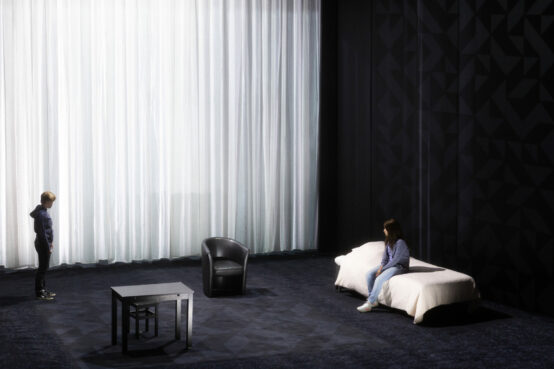 Ce qui frappe en premier dans la mise en scène de Joël Pommerat, c’est l’utilisation et la maitrise de l’espace. Par le truchement de projections savamment orchestrées par le vidéaste Renaud Rubiano et un jeu de lumière dompté par le comparse Éric Soyer, Pommerat parvient à alterner avec une rapidité déconcertante les décors comme autant de paysages mouvants, participants à cette sensation de persistante instabilité qui jamais ne quittera les spectateurs et spectateurs. Sont-ils et sont-elles témoins d’un rêve ? Quelles sont les limites de l’imagination ?